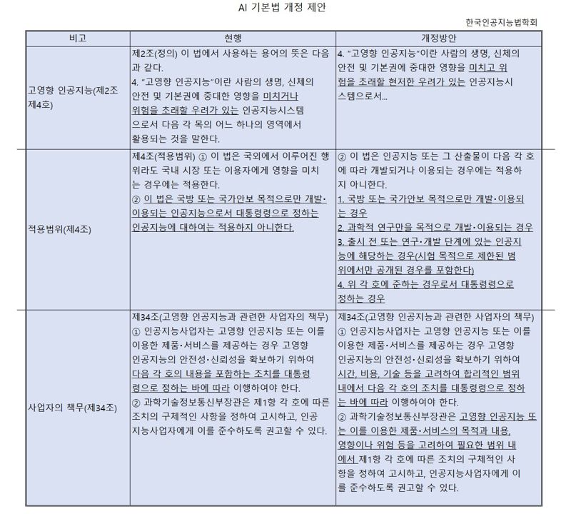 학계와 업계는 제정과 개정의 속도가 느린 법률이 급속히 변화하는 AI기술을 따라잡지 못해 시행과 동시에 구문이 될 수 있다는 우려를 내놓고 있다. 당장 AI기본법이 피지컬AI에 대한 규정을 내놓지 못하고 있다는 문제가 제기된다. AI기본법 제정을 추진하 당시에는 피지컬AI를 예상하지 못한 탓이다. '고영향AI' 처럼 불명확한 법률 조항도 개정 대상으로 꼽힌다. 최경진 한국인공지능학회장(가천대 교수)은 "높은 규제보다 더 나쁜 것이 불명확한 규제”라며 "가장 대표적인 것이 제2조 제4호 고영향AI의 정의조항"이라고 지적했다. 최 교수는 "현 AI 기본법은 ‘고영향’과 ‘고위험’ 개념이 혼재돼 고영향 인공지능을 단순히 ‘중대한 영향을 미치거나 위험을 초래할 우려가 있는 것’으로 규정하고 있는데, 이를 명확하게 정해야 한다"고 강조했다. 한국인공지능법학회는 현행 AI기본법 개정 조항을 연구해 국회에 개정제안을 내놓은 상태다.