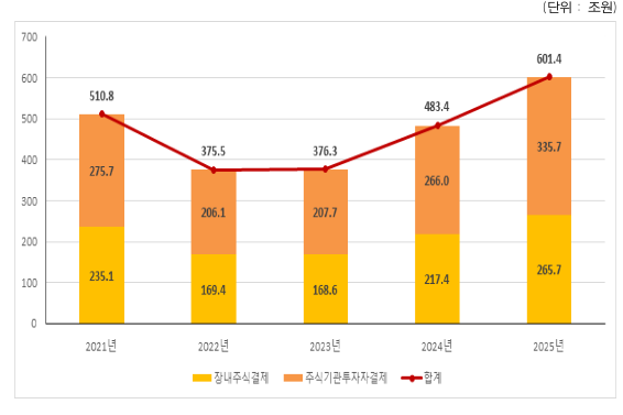 [파이낸셜뉴스] 한국예탁결제원은 2025년 주식결제대금 총액이 601.4조원이라고 12일 밝혔다. 일평균 2.5조원으로 전년(483.4조원) 대비 24.4% 증가한 것으로 집계됐다.