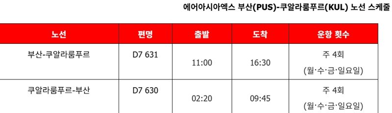 에어아시아의 부산-쿠알라룸푸르 노선은 주 4회(월·수·금·일요일) 운항할 예정이다. 부산 출발 편은 김해 국제공항에서 오전 11시에 출발해 현지 시각 오후 4시 30분에 쿠알라룸푸르 국제공항에 도착한다.