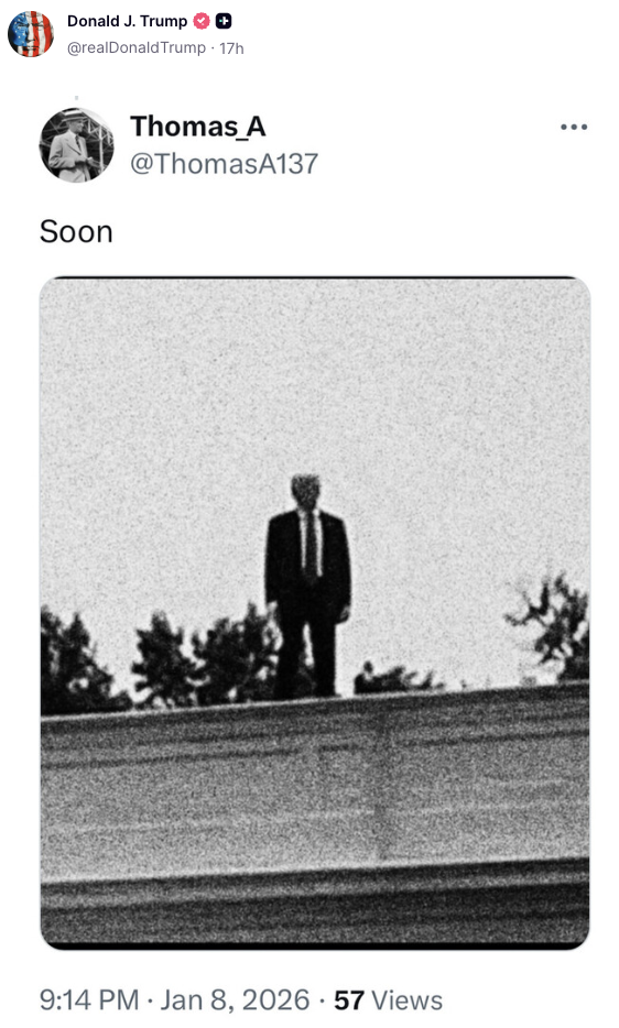 사진엔 워싱턴DC 백악관 옥상에 트럼프 대통령으로 보이는 인물이 서 있다. 짙은 흑백 처리를 해 얼굴의 이목구비는 뭉개져 있어 표정을 알아볼 수 없다. 해당 게시물엔 "이제 곧"(Soon)이라는 캡션만 붙어 있다.