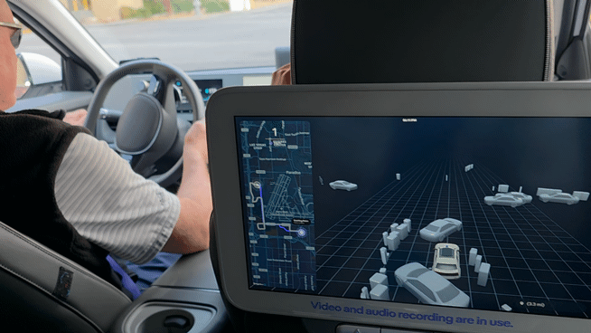 올해 말 라스베이거스에서 서비스 상용화를 앞둔 모셔널의 로보택시 '레벨 4' 자율주행 시범운행에 참여한 기자가 뒷 좌석 모니터에 뜬 '스타트 마이 라이드(Start my ride)' 버튼을 누르자 운전대가 스스로 움직이며 자율주행이 시작됐다.