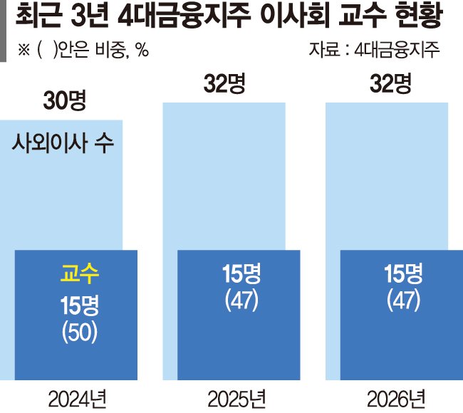 12일 파이낸셜뉴스가 최근 3년간 4대 금융지주의 이사회 구성을 분석한 결과 사외이사 가운데 현직 교수의 수는 줄곧 15명을 유지하고 있다. 이사회에서 차지하는 비중이 47~50%에 이른다.