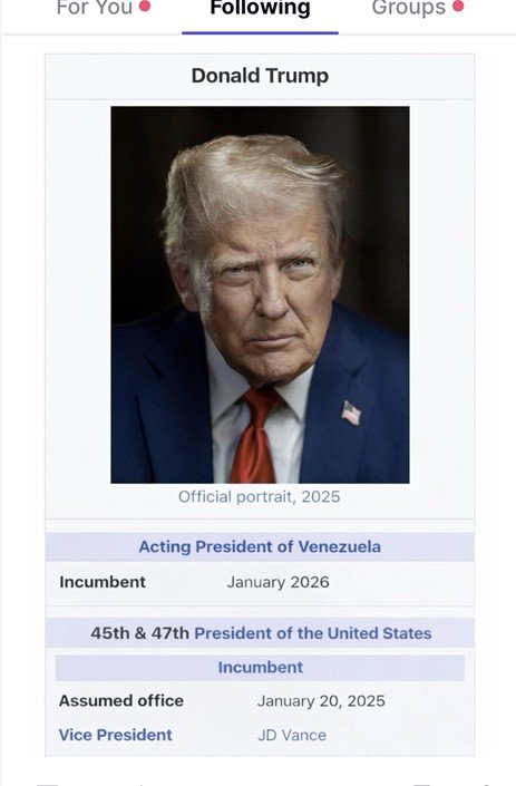해당 게시물에는 트럼프 대통령의 사진과 함께 ‘2026년 1월 현직’이라는 문구가 적혀 있었다.