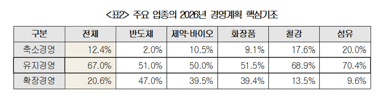 업종별로는 차이를 보였다. 반도체 기업의 47.0%가 '확장 경영'을 택했으며 제약·바이오(39.5%)와 화장품(39.4%) 산업도 평균을 웃도는 확장 응답률을 기록했다. 반면 섬유(20.0%), 철강(17.6%)은 '축소' 비중이 높았다.