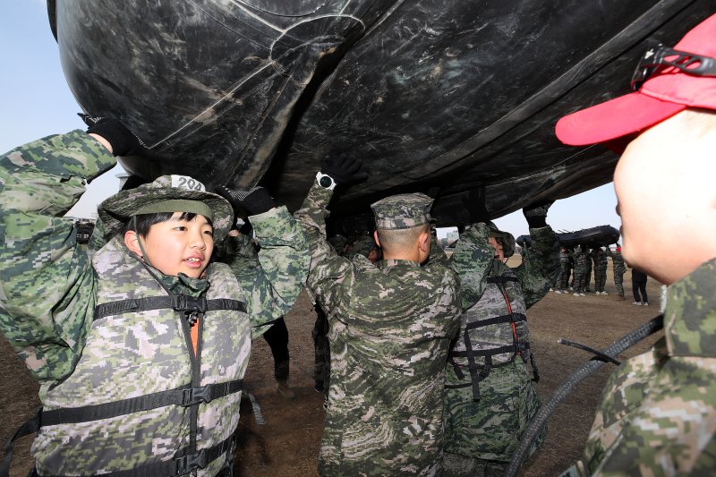 전국 각지에서 모인 중학생 10명이 140㎏에 달하는 IBS(소형고무보트)를 맨손으로 운반하기 위해 해병대 연병장에서 안간힘을 썼다.