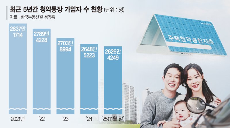 13일 한국부동산원 청약홈에 따르면 지난해 11월 말 기준 청약통장 가입자 수는 2626만4249명으로 집계됐다. 직전년도인 2024년 2648만5223명 보다 22만974명이 줄어든 수치로, 전 고점인 2021년 2837만1714명과 비교하면 210만7465명이 이탈했다.