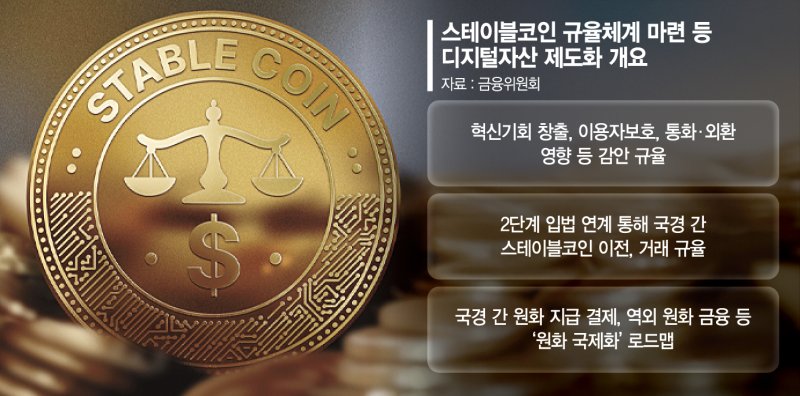 13일 국회 및 금융당국에 따르면 금융위원회는 정부의 '2026년 경제성장전략' 일환으로 올 1·4분기 중 스테이블코인 규율 체계가 담긴 디지털자산 2단계 입법을 추진한다. 이번 입법의 목적은 원화 스테이블코인의 안정성을 확보하고, 이를 법률상 지급·결제 수단에 준하는 수준으로 관리·운용하는 데 있다.