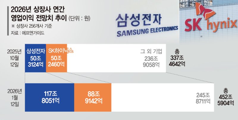 국내 증권사들이 전망한 삼성전자의 올해 예상 연간 영업이익 컨센서스는 117조8051억원으로 집계됐다. 불과 3개월 전(50조3124억원) 대비 67조4927억원 늘었다. SK하이닉스의 연간 영업이익 전망치도 3개월 전(50조2460억원)과 비교해 38조6682억원 늘어난 88조9142억원으로 나타났다. 삼성전자와 SK하이닉스의 영업익 전망치 합산 증가분(106조3364억원)이 전체 상장사 영업이익 전망치 상승 조정분의 92.2%를 차지했다.