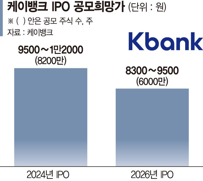 케이뱅크는 두 번째 IPO 추진시 공모주식 수 8200만주, 희망 공모가 9500~1만2000원을 제시하며 최대 5조원 수준의 기업가치를 산정한 바 있다. 이번에는 당시 희망공모가 하단이었던 9500원을 공모가 상단으로 설정해 공모가 범위를 8300~9500원으로 확정했다. 공모주식 수도 6000만주로 줄였다.
