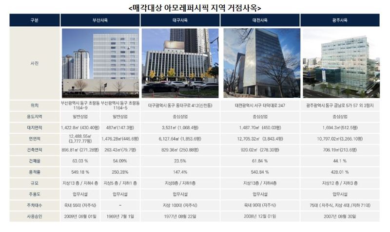빌딩별 연면적 규모는 △부산사옥 3777평, 초량빌딩 446평 △대구사옥 1853평 △대전사옥 3843평 △광주사옥 3466평이다.
