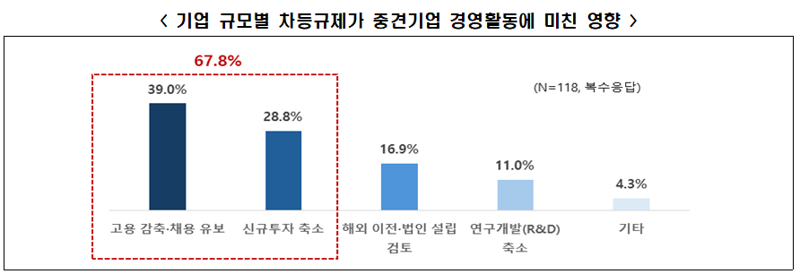 이로 인한 경영활동 위축도 뚜렷했다. 응답 기업 67.8%가 고용이나 투자를 줄였다고 응답했으며 구체적으로는 △채용 유보·감축(39%) △신규 투자 축소(28.8%) △해외 법인 이전 검토(16.9%) △연구개발(R&D) 축소(11%) 등의 영향을 받았다고 밝혔다.
