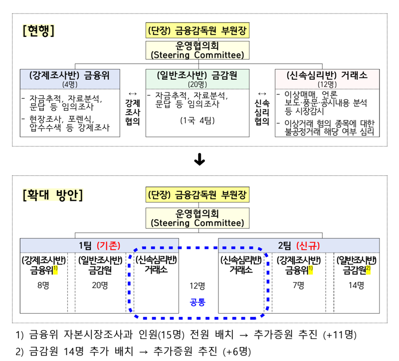 이에 금융당국은 금융위 강제조사반과 금감원 일반조사반을 각각 1개씩 추가 신설해 2개 팀 체제로 운영하고, 거래소 신속심리반은 두 팀을 공통 지원하는 방식으로 가동하기로 했다.