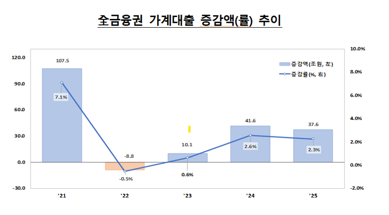14일 금융위원회가 발표한 '2025년 가계대출 동향'에 따르면 지난해 전 금융권 가계대출은 37조6000억원 늘어나 전년 말 대비 2.3% 증가했다.