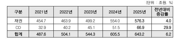 채권 발행 규모는 576.3조원으로 전년(554조원) 대비 4% 증가했고 CD 발행 규모는 66.9조원으로 전년(51.5조원) 대비 29.9% 증가했다.