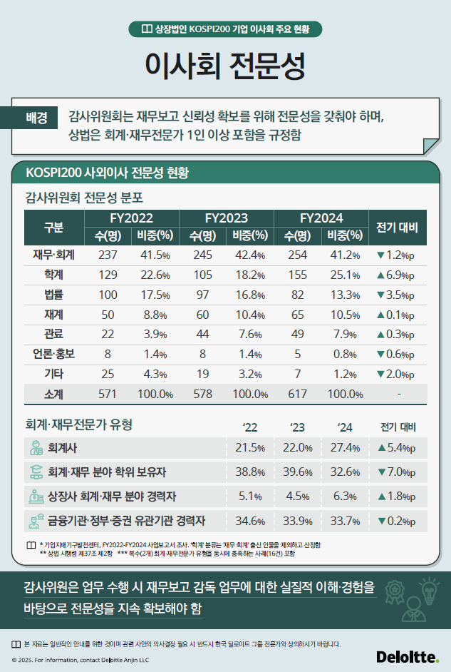 한국 딜로이트 그룹의 기업지배기구발전센터가 14일 발간한 '기업지배기구 데이터 동향 제6호'에 따르면 FY2024 기준 감사위원의 41.2%(254명)이 ‘재무·회계’ 전문가로 나타났다. 이어 학계 25.1%(155명), 법률 13.3%(82명) 등의 순으로 나타났다. 상법상 회계 또는 재무전문가 요건을 충족하는 감사위원을 유형별로 구분한 결과, ‘금융기관·정부·증권유관기관 등 경력자’가 33.7%(91명), ‘회계·재무 분야 학위 보유자’가 32.6%(88명)로 높은 비중을 차지했다. 이는 복수(2개)의 재무·회계 전문가 유형을 동시에 충족하는 사례 16건 포함한 수치이다.