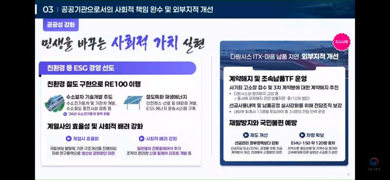 14일 정정래 코레일 사장직무대행은 정부세종청사에서 열린 '국토교통부 산하 공공기관 업무보고'에서 "다원시스의 ITX-마음 납품 지연과 관련한 외부 지적을 엄중히 받아들이고, 제도 전반을 개선하겠다"고 밝혔다.