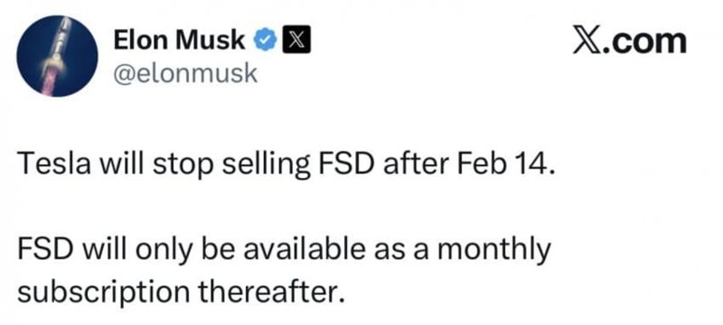 일론 머스크 테슬라 최고경영자(CEO)는 14일(현지시간) 자신의 엑스(X·옛 트위터)를 통해 "테슬라는 2월 14일 이후 FSD 판매를 중단할 것"이라면서 "FSD는 오직 월간 구독방식으로만 제공하겠다"고 밝혔다.