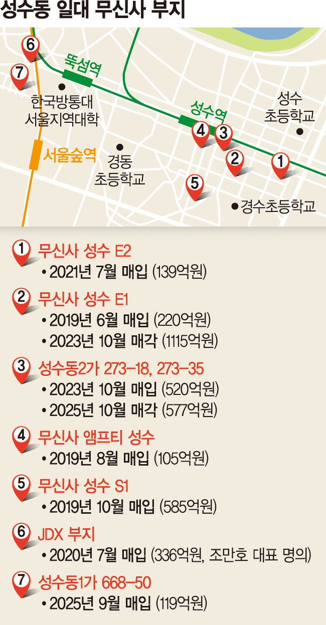 2019년 220억원에 매입한 동부자동차서비스 부지는 자산운용사 마스턴투자운용과 무신사 캠퍼스 E1으로 개발한 뒤 마스턴투자운용에 1115억원에 매각했다. 시세차익은 900억원에 달한다.