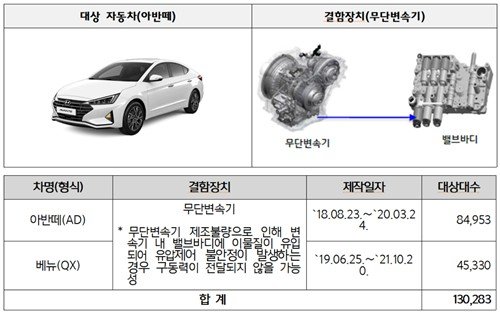 이번 리콜은 제작 결함이 발견된 데 따른 조처다. 현대차 아반떼 등 2개 차종 13만283대는 무단변속기 부품 내부로 이물질이 유입돼 구동력이 전달되지 않을 가능성이 제기됐다. 리콜은 오는 19일부터 진행한다.