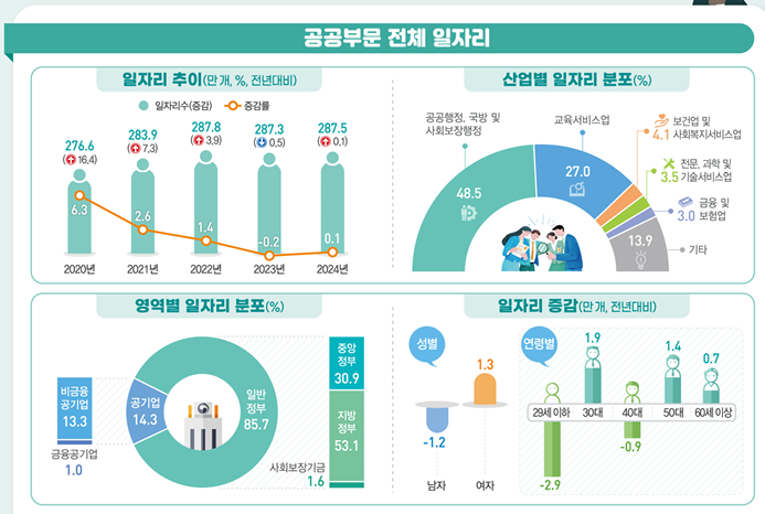 성별로는 남성 일자리가 146만9000개, 여성 일자리가 140만6000개였다. 남성 일자리는 1만2000개 감소한 반면 여성 일자리는 1만3000개 증가했다. 일반정부에서는 여성 일자리가 남성을 넘어섰고, 공기업에서는 여전히 남성이 여성의 1.5배 수준이었다. 신규 채용 일자리는 여성 비중이 더 높게 나타났다.