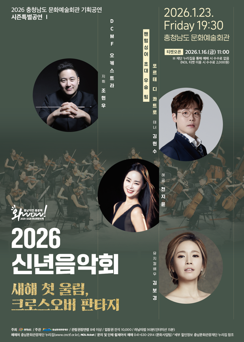 충남문화관광재단이 오는 23일 오후 7시30분 충남 예산 충청남도문화예술회관에서 2026 신년음악회 '새해 첫 울림, 크로스오버 판타지’를 개최한다고 15일 밝혔다.