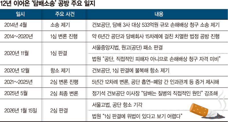 이날 2심 선고 직후 정 이사장은 "판결 결과는 존중하지만, 흡연 피해에 대한 사회적 책임을 묻는 공단의 역할은 여기서 멈출 수 없다"며 대법원에 상고할 계획도 밝혔다.