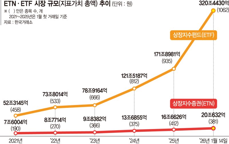 ETF와 달리 ETN은 상장도 정체됐다. ETN 종목 수는 381개로, 지난해 초 412개에서 31개 줄었다. 같은 기간 ETF 종목 수가 935개에서 1062개로 127개 늘어난 것과 대조적이다.