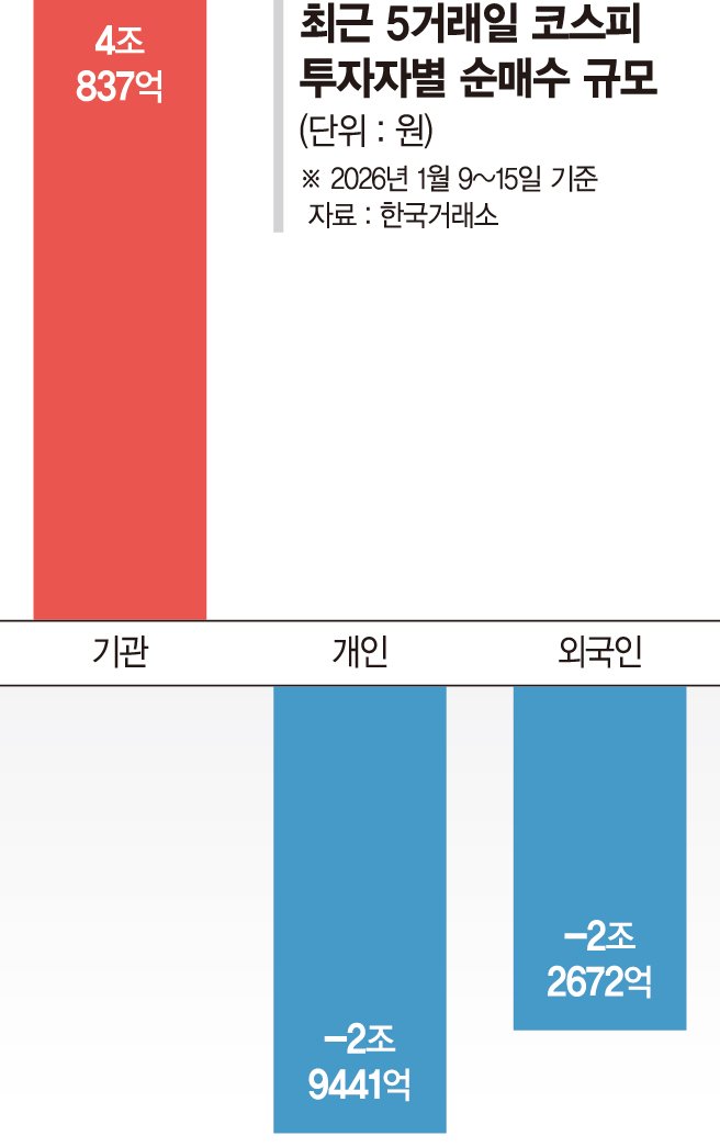 15일 한국거래소에 따르면 외국인이 매도 우위로 전환한 이후 최근 5거래일(1월 9~15일) 연속으로 기관이 순매수를 이어가며 코스피 지수 상승을 견인하고 있다. 이 기간 기관은 코스피 시장에서 4조837억원을 순매수한 반면, 외국인과 개인은 각각 2조2672억원, 2조9441억원을 순매도했다. 특히 15일 하루에만 기관이 1조2930억원을 순매수하며 지수 상단을 끌어올렸다.