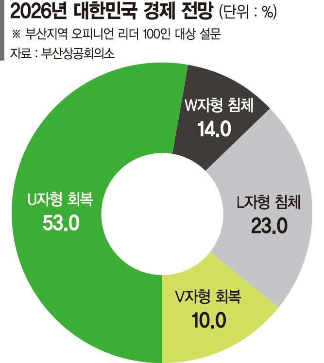 부산지역 오피니언 리더 53.0%는 올해 우리나라 경제에 대해 완만한 U자형 회복을 보일 것으로 전망했다. 반면 L자형 장기 침체에 대한 전망도 23.0%에 달해 내수부진과 대미관세 등으로 인해 경기부진에 대한 경계감이 여전히 높은 상황인 것으로 나타났다.