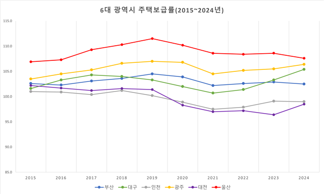 16일 울산시에 따르면 국토교통부가 분석한 2024년 기준 울산의 주택보급률은 107.6%로 나타났다. 지난 2015년 이후 2024년까지 10년간 주택보급률이 100%를 넘었으며, 6대 광역시 중에서는 가장 높은 수치를 기록했다.
