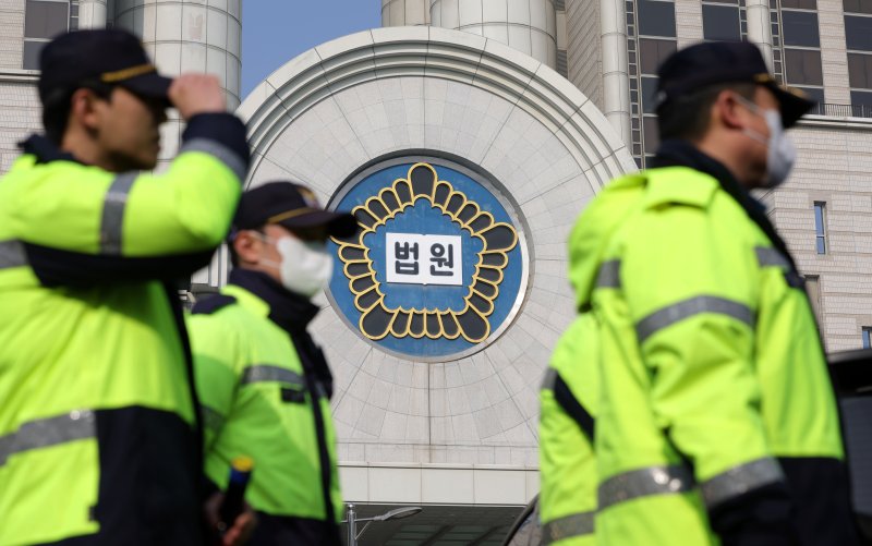 윤석열 전 대통령의 체포영장 집행 방해 혐의 등 1심 선고기일인 16일 오후 서울 서초구 서울중앙지방법원 앞에서 경찰들이 근무를 서고 있다. 뉴시스