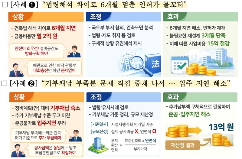 의정부 주택사업의 경우 방화구획 적용 범위를 둘러싼 건축법 해석 차이로 사업 승인이 장기간 지연됐으나, 지원센터가 관계 부처와 공동주택 도면을 직접 검토해 사업자 해석이 타당하다는 유권해석을 제시하면서 인·허가 절차가 즉시 재개됐다. 이를 통해 재설계에 따른 금융비용 등 약 15억원의 불필요한 비용을 줄였다.