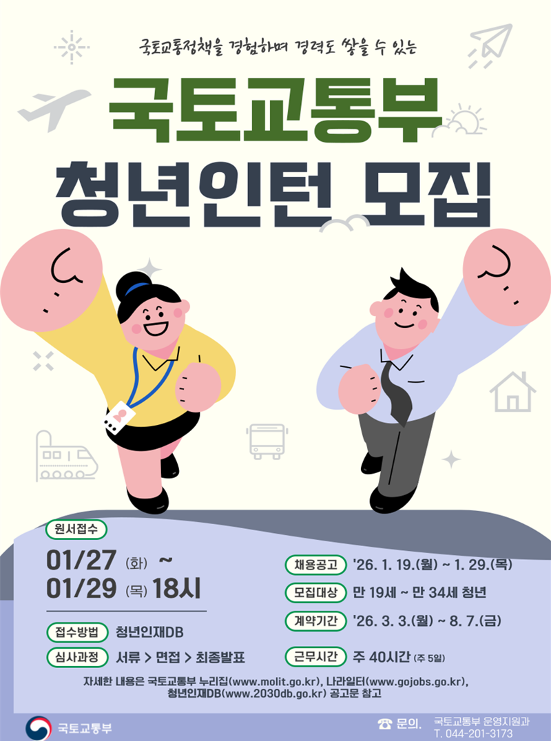 청년인턴은 국토·주택·건설·교통 정책 수립 과정은 물론 건설현장 점검과 항공 관제·운항·정비 행정 지원 등 정책 집행 단계의 업무에도 참여한다. 국토부는 전공과 관심 분야를 최대한 고려해 부서를 배치할 방침이다.