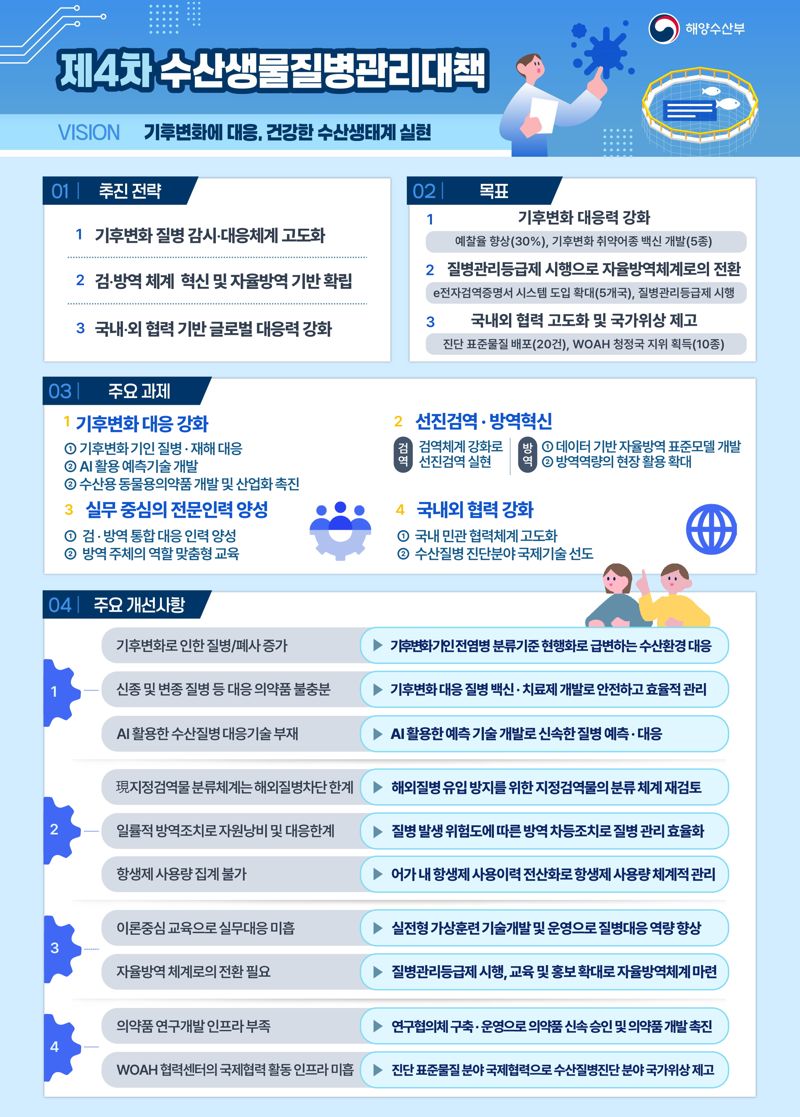 국내 양식업은 지난 10년 동안 지속 성장하고 있으나 기후변화와 양식 품종의 다양화 등에 따라 새로운 질병 발생과 병원체 확산의 위험성이 커지고 있다. 이에 해수부는 수산생물 질병 예방과 확산 방지를 위해 지난 2007년 ‘수산생물질병 관리법’을 제정하고 5년마다 법정기본계획인 해당 관리대책을 수립해 오고 있다.