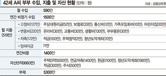 42세 A씨 부부 월 수입은 590만원이다. 연간 비정기 수입은 1500만원이다. 월 지출은 519만원이다. 고정비는 주담대원리금(52만원), 보험료(33만원), 통신비(12만원), 가족모임회비(10만원), 어린이집(20만원) 등 127만원이다. 변동비는 관리비(30만원), 교통비(30만원), 생활비(130만원), 부부용돈(30만원) 등 220만원이다. 저축은 주택청약(2만원), 청년도약계좌(70만원), 적금(100만원) 등 172만원씩 하고 있다. 이를 제외하고 남는 자금은 71만원이다. 연간 비용은 1400만원이다. 자산은 주택(5억5000만원), 연금저축(1400만원), 현금(1100만원), 청년도약계좌(1560만원), 적금(300만원), 주식(500만원) 등 총 5억9860만원이다. 부채는 5300만원이 있다.