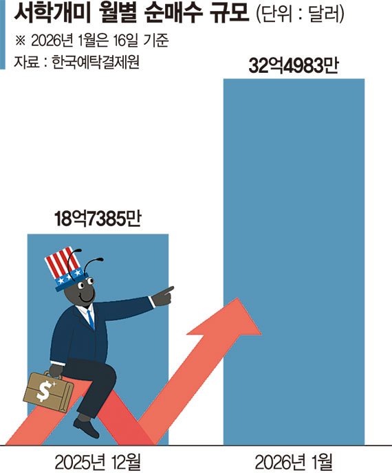실제 같은 기간 S&P500 지수와 나스닥 지수는 모두 1%대 상승에 그쳤다. 연초 미국 증시가 숨 고르기에 들어간 상황에서 원·달러 환율이 한때 하락하자 서학개미의 미국 주식 매수 속도가 급격히 빨라졌다는 분석이다. 서학개미의 미국 주식 순매수세 확대와 함께 최근 원·달러 환율이 다시 오르자 외환당국의 경계심도 커지고 있다.