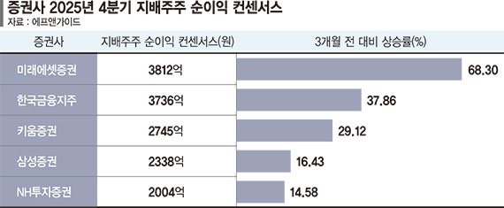 특히 미래에셋증권에 대한 실적 기대감이 높아졌다. 미래에셋증권의 지난해 4·4분기 지배주주 순이익 컨센서스는 3812억원으로, 3개월 전 대비 68.30% 급증했다. 같은 기간 한국금융지주의 컨센서스는 3736억원으로 37.86% 올랐고, 키움증권(2745억원)은 29.12%, 삼성증권(2338억원)은 16.43%, NH투자증권(2004억원)은 14.58% 증가했다.
