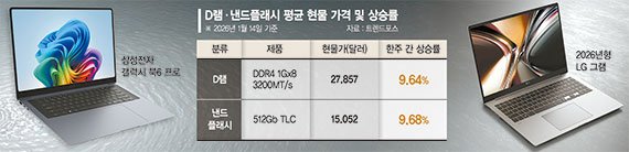 IT 기기에 필수적으로 들어가는 메모리 가격 급등세가 소폭이라도 꺾일 조짐을 보이지 않으면서 제조사들은 비상이 걸렸다. LG전자가 이달 출시한 2026년형 'LG 그램 프로 AI' 16형 인텔 코어 울트라 5 모델 출고가는 314만원으로, 전작(264만원) 대비 50만원 비싸졌다.