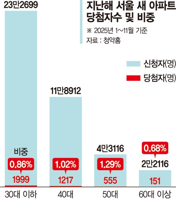 서울에서 지난해 1~11월에 공급된 단지 전체를 분석해도 사정은 크게 다르지 않다. 지난해 30대 이하 당첨자는 1999명을 기록했다. 반면 같은 연령대 신청자는 23만2699명으로 당첨 비중이 0.86%에 불과했다.