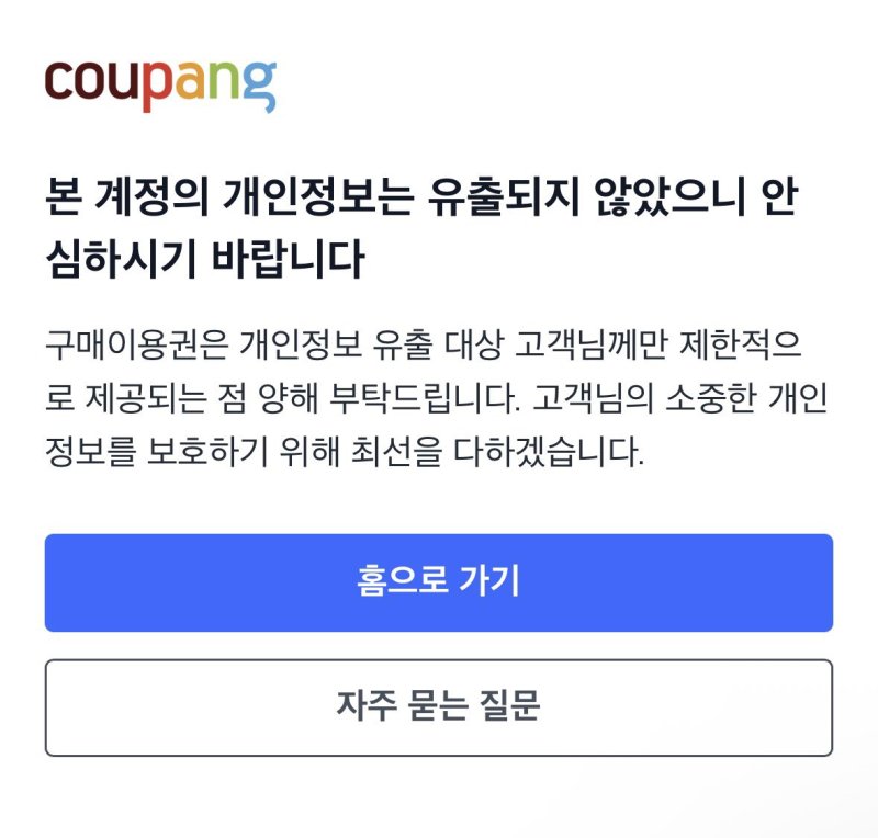 실제 일부 쿠팡 이용자 계정에는 '본 계정의 개인정보는 유출되지 않았으니 안심하시기 바란다. 구매이용권은 개인정보 유출 대상 고객에게만 제한적으로 제공된다'는 안내가 이뤄졌다.