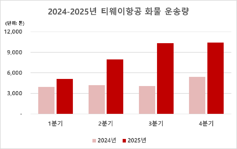 [파이낸셜뉴스] 티웨이항공은 2025년 화물 운송 실적으로 연 3만4000t을 달성하며 역대 최대 화물 실적을 기록했다고 19일 밝혔다. 2024년 약 1만8000t 대비 92% 증가했다. △중·장거리 노선의 안정적인 확장 △효율적인 화물 전용 운송 전략 △탄력적 공급 조절 등 이 맞물린 결과로 분석된다.