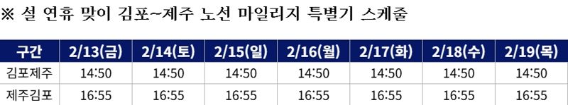 이번 마일리지 특별기는 연휴가 시작되는 2월 13일부터 7일간 매일 2편씩 총 14편 운영한다. 김포~제주 노선 특정 시간대에 마일리지로 우선 발권이 가능하도록 마련됐다.