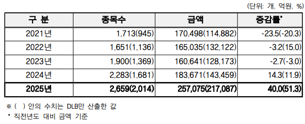 한국예탁결제원은 지난해 파생결합사채(DLB)를 포함한 파생결합증권(DLS) 발행 금액이 25조7075억원으로 전년 대비 40% 증가했다고 19일 밝혔다.