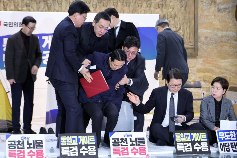 장 대표는 느린 속도로 짧게 발언했다. 장 대표는 여권의 통일교 유착과 공천 헌금 의혹에 관한 특검법 수용을 촉구하면서 지난 15일 단식 농성을 시작한 이후 국회 로텐더홀을 떠나지 않고 밤에는 텐트에서 눈을 붙이고 있다.