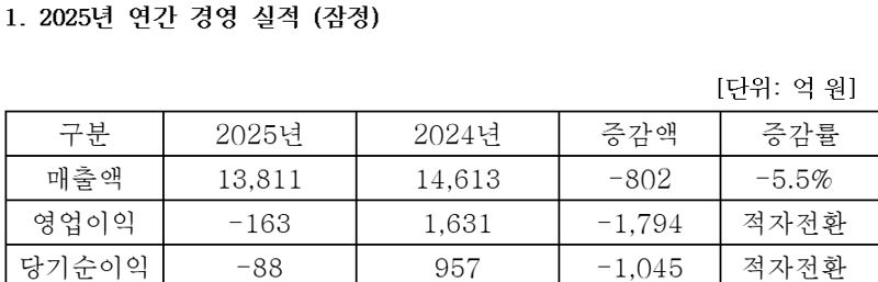 [파이낸셜뉴스] 진에어는 2025년 영업이익이 -(마이너스)163억원으로 전년 동기 1631억원 대비 적자전환했다고 19일 밝혔다. 순이익도 2025년 -88억원으로 2024년 957억원 대비 적자전환했다. 매출액은 2025년 1조3811억원으로 2024년 1조4613억원 대비 5.5% 줄었다.