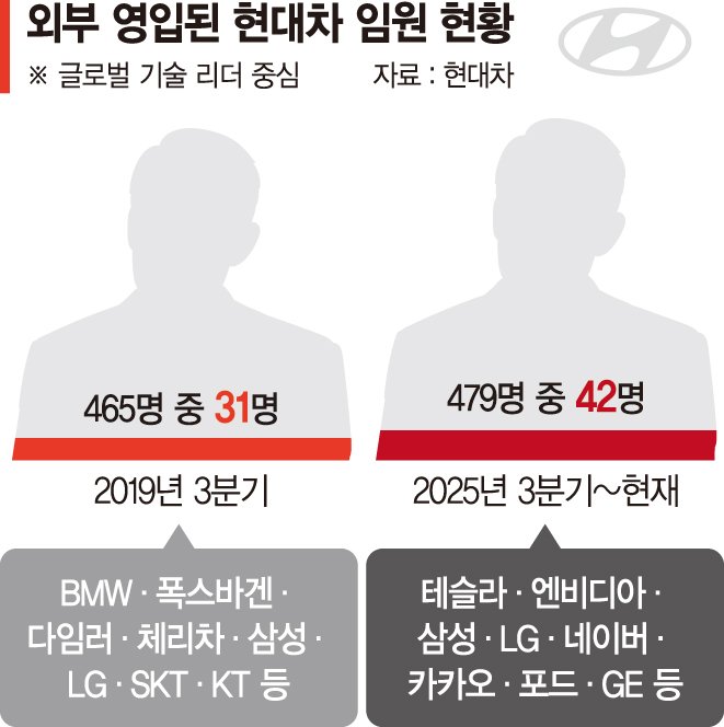 정의선 현대차그룹 회장 체제 이전인 2019년 3·4분기에도 현대차의 상무급 이상 임원 465명 중 31명이 외부 영입 인사였다. 기술인재 중 외국인 임원 수는 같은 기간 13명에서 10명으로 줄었고, 글로벌 기업에서 경험을 쌓은 한국인 기술인재들이 지속적으로 많이 영입된 것으로 나타났다.