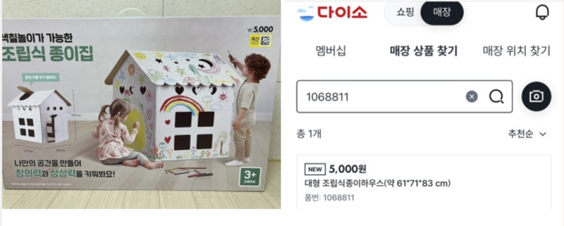 [파이낸셜뉴스] 5000원짜리 가성비 육아템이 인기다. 다이소에서 판매 중인 조립식 종이집은 방학 시즌을 맞아 부모들의 수요가 몰리면서 매장마다 품절 사태를 빚고 있다. 온라인에는 사용 후기와 함께 구매 방법을 공유하는 글들이 올라오고 있다.
