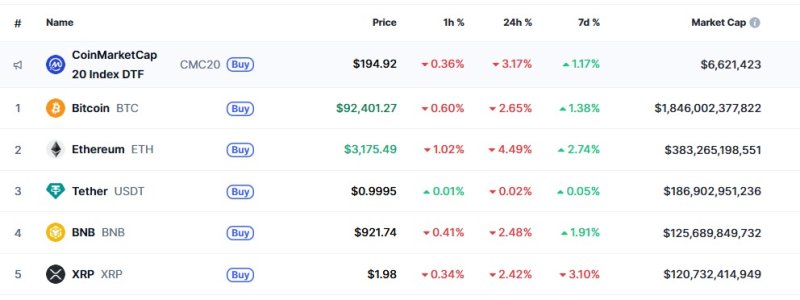 암호화폐도 일제히 하락하고 있다. 같은 시각 글로벌 코인 시황 중계사이트 코인마켓캡에서 비트코인은 24시간 전보다 2.65% 하락한 9만2401달러를 기록하고 있다. 9만3000달러 선이 붕괴한 것.