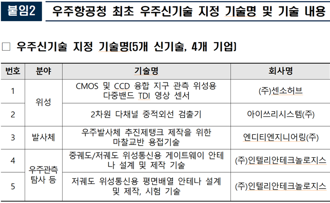 이번에 선정된 5개의 우주신기술은 위성 및 발사체 제작, 우주관측탐사 분야의 기술들로, 고성능 영상 센서와 적외선 검출기, 발사체 추진제탱크 제작 공정, 차세대 위성통신 안테나 기술을 망라하고 있다. 센소허브의 CMOS 및 CCD 융합 다중밴드 TDI 영상 센서는 고화질과 저전력을 동시에 구현해 고속 지구관측에 최적화된 기술이며, 아이쓰리시스템의 2차원 다채널 중적외선 검출기는 미세한 온도 차이를 감지하는 중적외선 영상 획득으로 정밀 위성 영상 서비스 제공에 이바지할 것으로 기대된다.