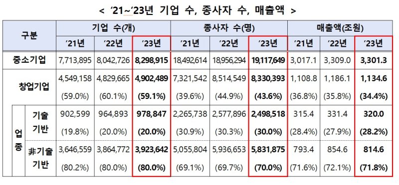 먼저 창업기업 일반 현황 조사에 따르면 2023년 전체 창업기업 수는 전체 중소기업의 59.1%를 차지하는 490만2489개로 전년 대비 1.5% 증가했다. 3년 연속 증가세다.